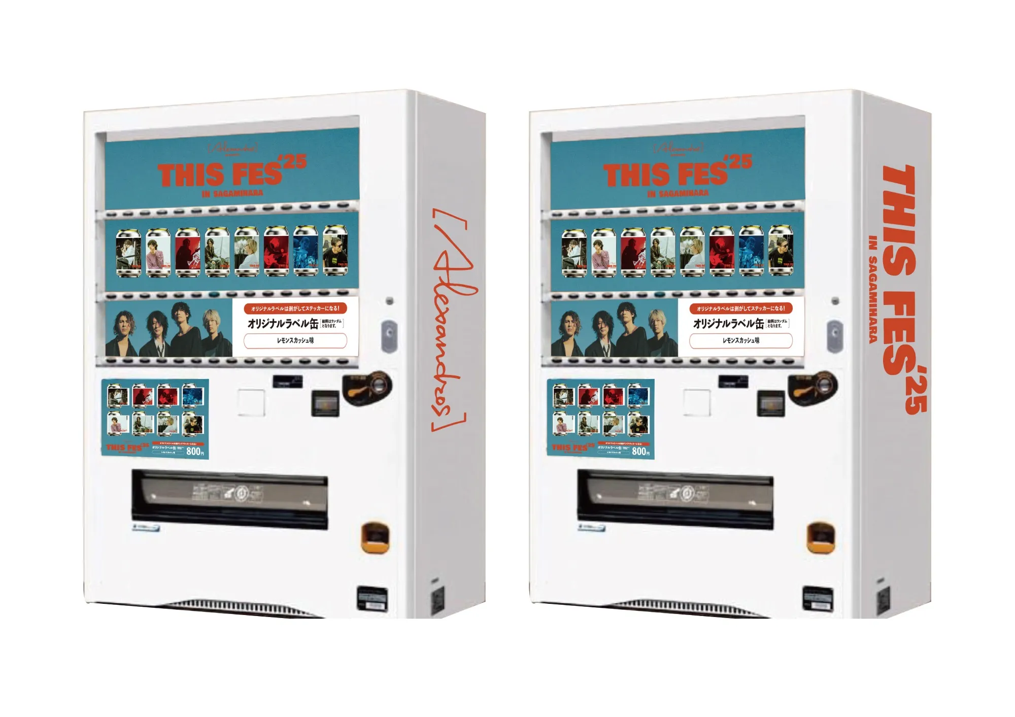 THIS FES’25会場内に設置販売され大好評だった「[Alexandros] TAG LIVE LABEL 缶」自販機が、川上洋平と白井眞輝の出身校「弥栄高校」に隣接している『淵野辺公園』と、相模原市民に馴染み深い『オギノパン本社工場』の2ケ所に常設されることが決定しました。